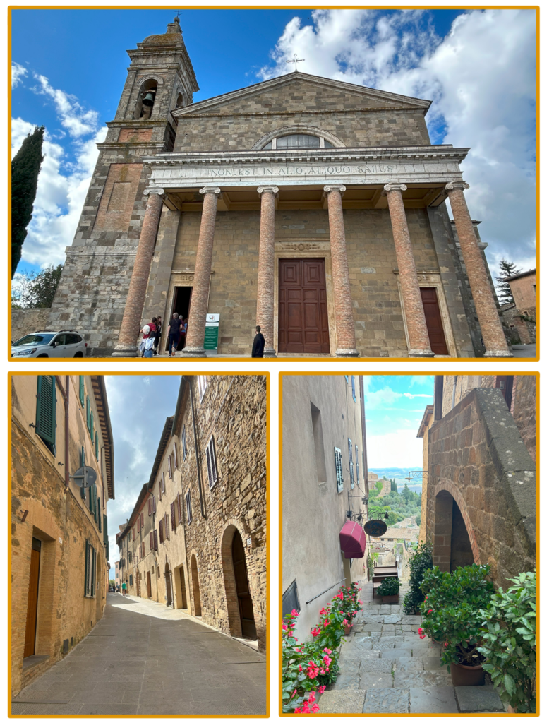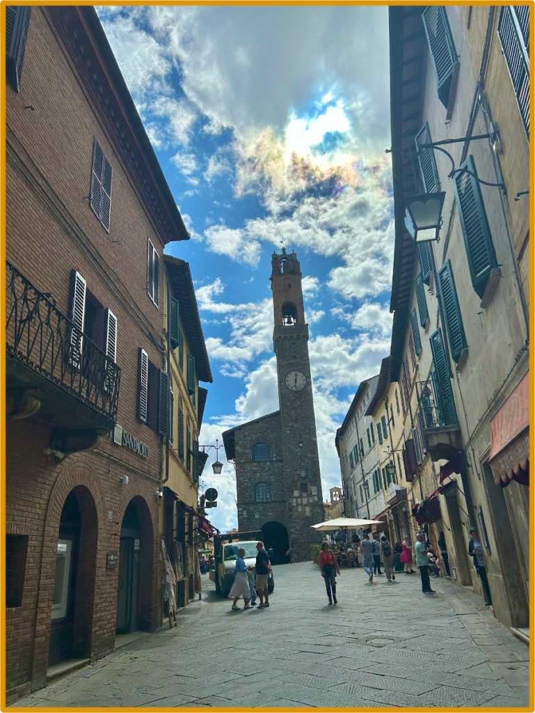 テイスティングの後は、モンタルチーノの街並みを1時間ほど自由に散策する。モンタルチーノは坂道や階段が多く、写真を撮りたくなる小道や路地がたくさんあった。建物の雰囲気は運河がないヴェネツィア、こじんまりしたフィレンツェだろうか。中世、シエナ共和国に属するまではモンタルチーノだけで1つの共和国だったので、村というよりは小さな都市だ。お土産が買える店やレストラン、ホテルも結構あるが、ワインの店がやはり多い。散策しつつ、村の高台にあるドゥオモ(大聖堂)や、細長い時計塔が目印のプリオーリ宮といったランドマークを見て周り、1時間はあっという間に終わった。