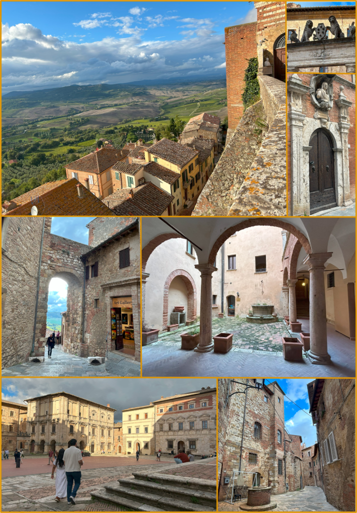 ツアーの待ち合わせ場所に着くと、ツアーに参加する人々でごった返していた。修学旅行ぐらいの大人数で、大型バスに乗って移動するタイプのようだ。参加するツアーの種類によって、違う色のステッカーを渡されているようで、私たちは茶色のステッカーだった。あたりを見渡し、同じ茶色のステッカーの人を見つける。この人について行けば、ツアーに置いていかれることはないだろう。バスに乗り込むと、ガイドのセバスチャンが英語とスペイン語で注意事項を説明してくれる。英語はちゃんと8割くらい聞き取れるので安心した。グアムでは訛りが強くて全然分からなかったし、イタリアでも聞き取りにくい人もいたので心配していたが、大丈夫そうだ。今日のツアーでは、モンタルチーノ、ピエンツァ、モンテルプルチャーノの3つの村を訪れる。モンタルチーノとモンテプルチャーノでは、ワインの試飲もある。