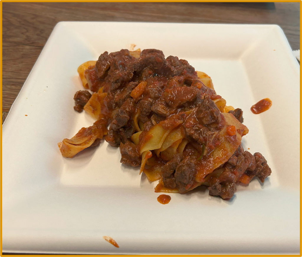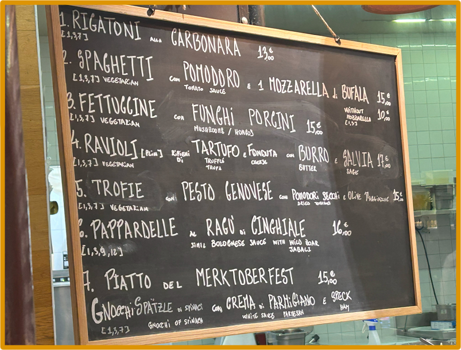 夫がボロネーゼパスタかトマト味のパスタを食べたいと強く主張するので、パスタ店に並んでみる。フードコートはめちゃくちゃ喧しいので、声を張らないと注文できない。しかも、メニューはイタリア語のみだ。今までのレストランがどこも英語とイタリア語両方書いてくれている店ばかりだったので、油断していた。イタリア語はさっはり分からないが、幸いなことにパスタの名前はイタリア語のまま日本に浸透しているものが多い。ローマ字読みをすればジェノベーゼやカルボナーラなど判読可能だ。そしてボロネーゼは…分からないが、RAGUと書いてあるのはラグーソースのことで、ミートソース系統のはずである。発音が分からないのでメニューを指さして注文する。これで全然違うものが出てきたらどうしよう…と、スタッフが緑色のソースを鍋に入れたり、クリーム系の黄色いパスタを皿に盛り付けるたびにドキドキしたが、私たちの番が来て、ミートソースっぽい色のソースを大鍋で混ぜ始めたのでひとまず安心だ。できあがったパスタは日本の1.5倍くらいのボリュームで、16ユーロ。まあ妥当だ。フードコートの席を探して食べてみたが、これがなかなか美味しかったし、ちゃんとラグーソースだった。しかも、日本だと申し訳程度のミンチがパスタに乗っているだけだが、細切れ肉がごろごろ入っていたのがかなり好評価ポイントだった。これには夫も満足したようである。