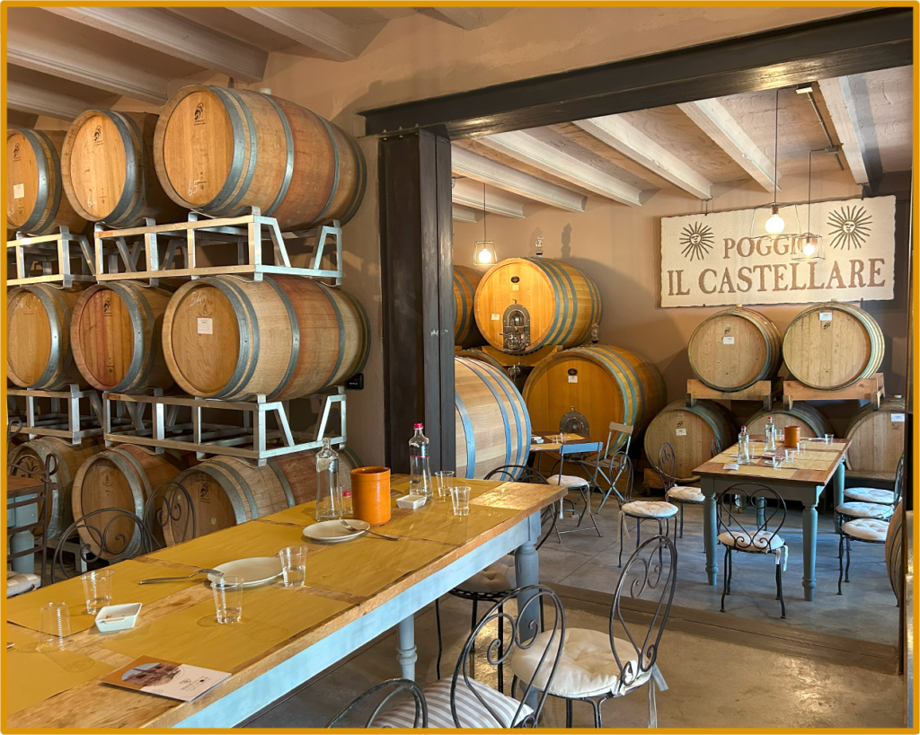 まず訪れたのは、Tenuta Poggio Il Castellareという、モンタルチーノのホテルに併設されたワインセラーだ。ここでは、ブルネッロ・ディ・モンタルチーノという超有名赤ワインを含む、3種類のワインをテイスティングさせてもらった。おつまみとして、クルトンみたいな食感のバゲットとサラミが置かれている。このサラミ、胡椒が効いていてとても美味しく、皆が残したサラミを夫はせっせと口に運んでいた。肝心のワインの方であるが、イタリアで初めてDOCGの認定を取ったらしく、分かる人が飲めばその良さが分かるのであろう。
