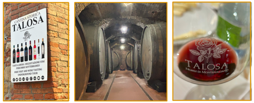 ピエンツァの後に向かったのは、モンテプルチャーノだ。こちらもワインの産地で有名な村である。ここのTalosa – Cantina Storicaというワインセラーは面白くて、入店後果てしない階段を下に下に降りて行き、天井や壁が岩肌剥き出しの地下通路を通り、古いレンガ造りのワイン蔵にたどり着くのである。ワインの樽は直径1m以上もありそうな巨大な樽で、迫力がすごい。テイスティングには、3種類のチーズとオリーブオイルのかかったバゲットが用意されていた。今飲んでいるワインにどのチーズを合わせると良いのか、4人がけテーブルで相席になった親切なご夫婦が教えてくれた。ご主人はロシアン・マフィアみたいな見た目をしているが、気さくで親切な人だった。格付けチェックのようにワイングラスを回し、香りを楽しむフリをしてから飲んだ。隣で夫もワイングラスを光に翳し、ワインの色を楽しむフリをしている。味の良さは正直分からない。やっぱり葡萄ジュースが一番美味しい。