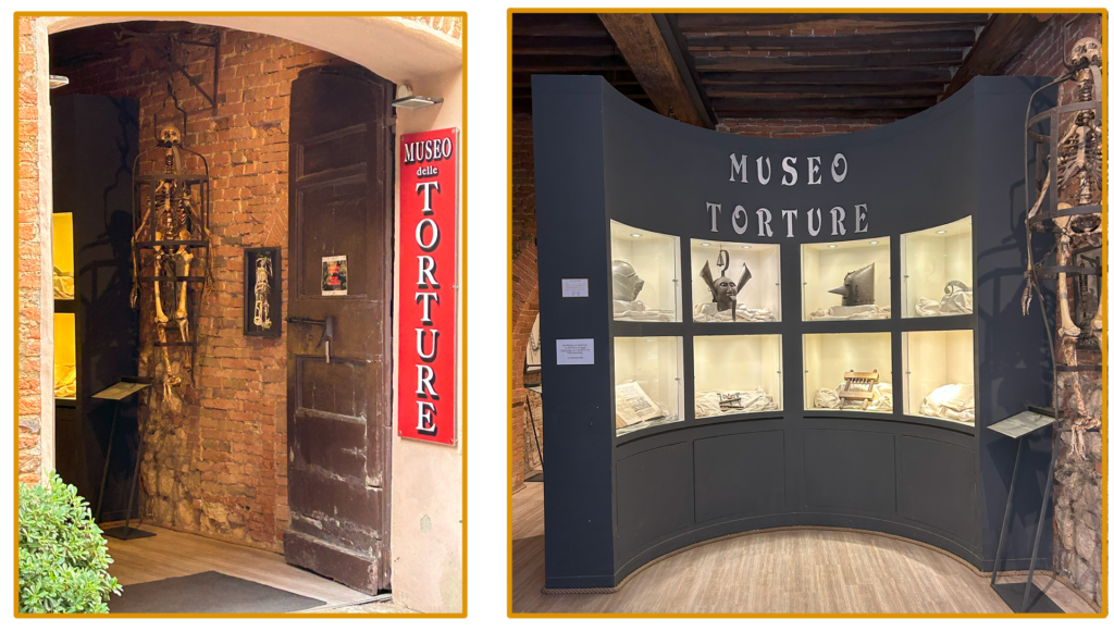 モンテプルチャーノの街は、モンタルチーノ、ピエンツァと似ているが、年季の入った石造りの壁はかなり古くて雰囲気があり、個人的に3つの村の中で一番好きかもしれなかった。街を散策していると、拷問器具のミュージアムがあり、そこだけ異彩を放っていた。入口には拷問器具を付けられた骸骨がぶら下がっており、どうやって使うのか分からない拷問器具が展示されていた。