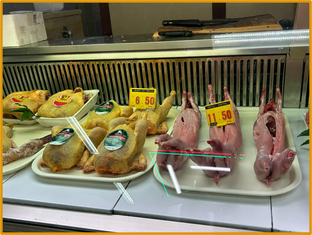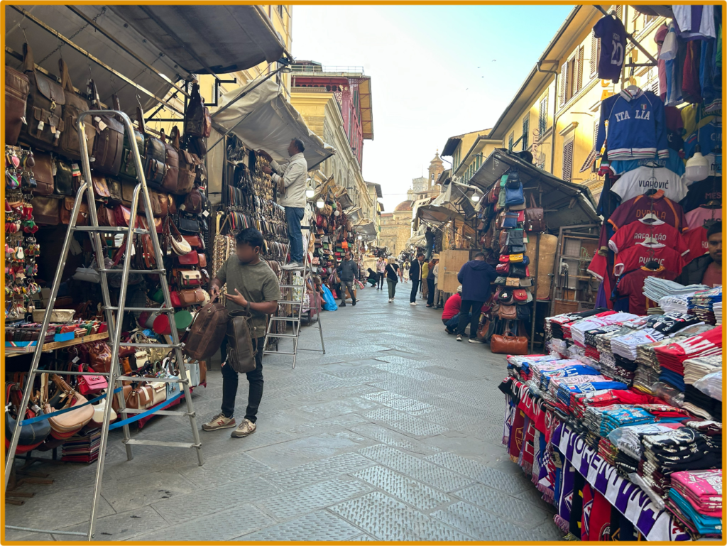 さて、タクシー問題が解決したと信じて疑わない私たちは、フィレンツェ観光に繰り出した。まずは、昨日の夜にも訪れた中央市場へ向かう。朝の9時ぐらいに行くと、バッグやベルトなどの革製品の露店が市場の周りにたくさん出ていて、1階の生鮮食品コーナーも営業していた。売っているのは野菜に果物、ワインにハムとチーズと肉、そしてハムとチーズと肉だ。ハム・チーズ・肉の店舗数だけ異常に多い。そしてどれも塊で売られていて迫力満点だ。肉は、少し珍しいので言うとウサギ肉だろうか。皮と内臓を取られたウサギが、1羽丸ごとの状態で並んでいる。