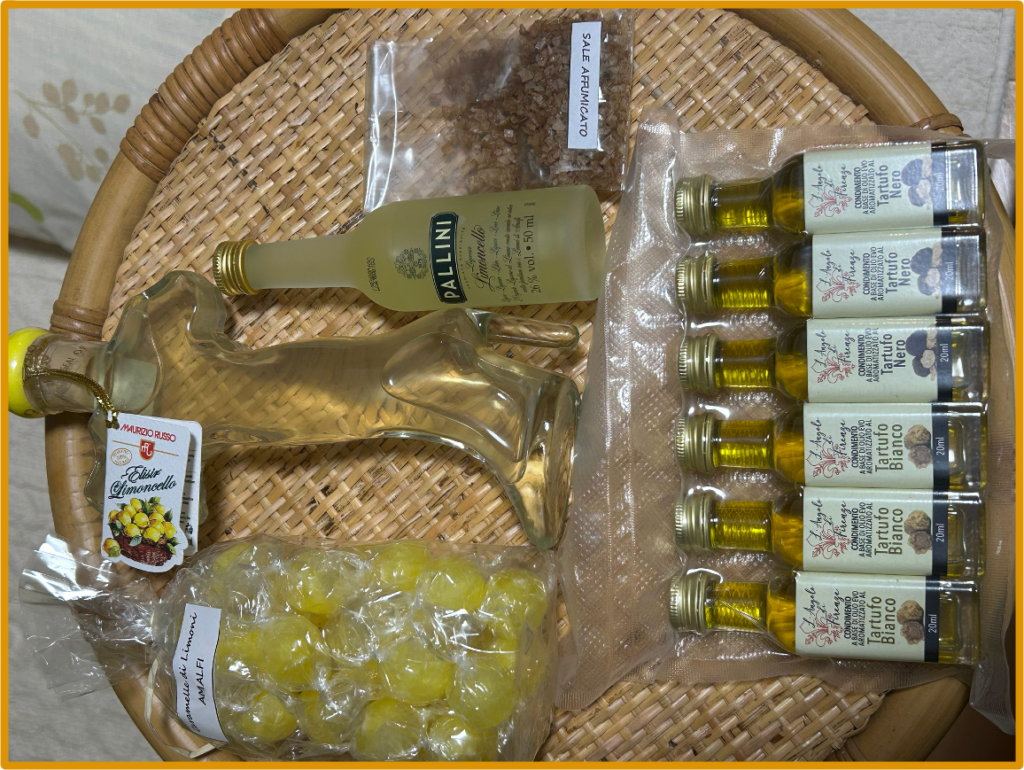 熟慮の末、イタリアの国土と同じ長靴の形をしたガラス瓶に入った、リモンチェッロというリキュールと、白と黒のトリュフオイル、燻製した岩塩、超美味しいらしいレモン飴を購入した。レモン飴は、真ん中がとても酸っぱくて外側が甘く、合わさるととても美味しいらしい。リモンチェッロは、冷やして飲むのが一番美味しいとのことだ。たまたま日本人でフィレンツェに20年住んでいる店員さんがいて、リキュールの飲み方など詳しく聞くことができた。