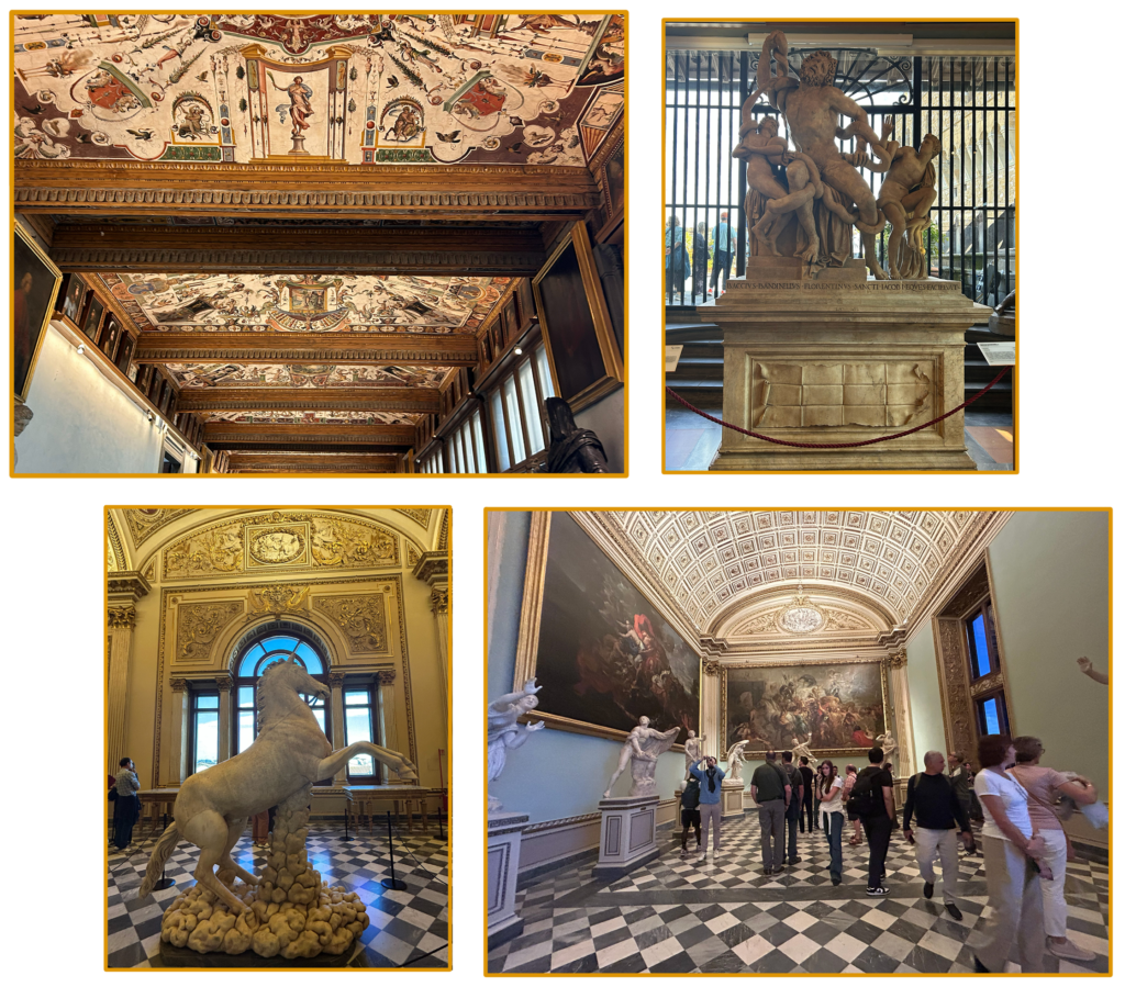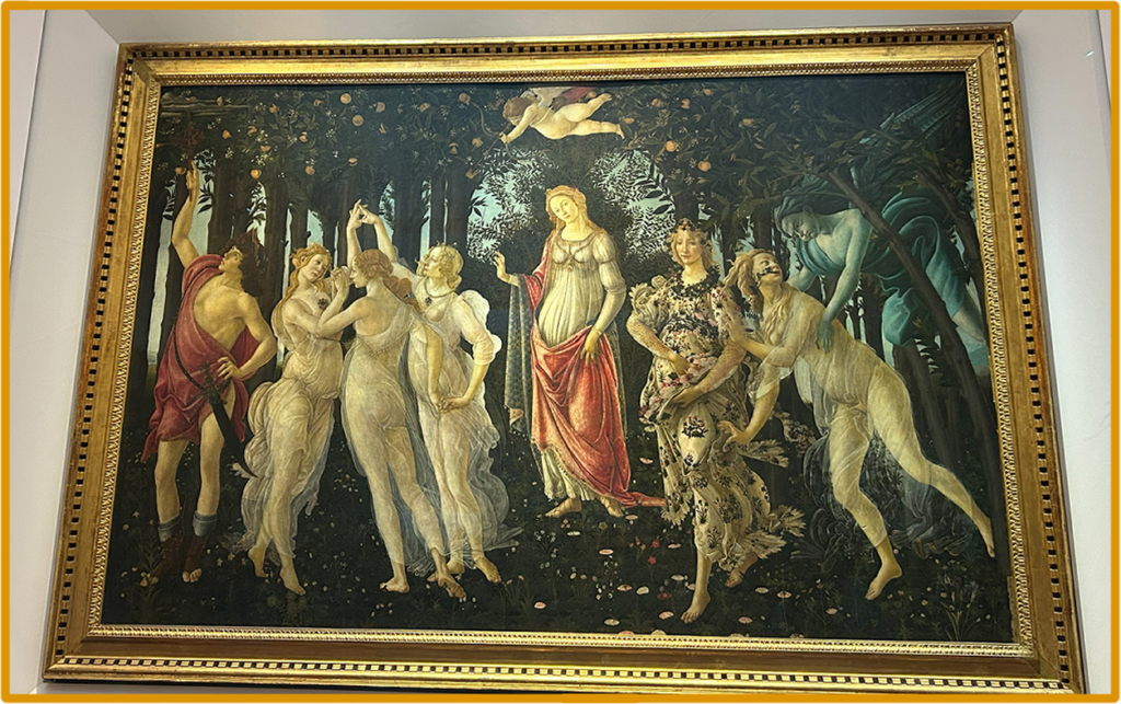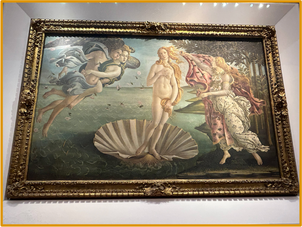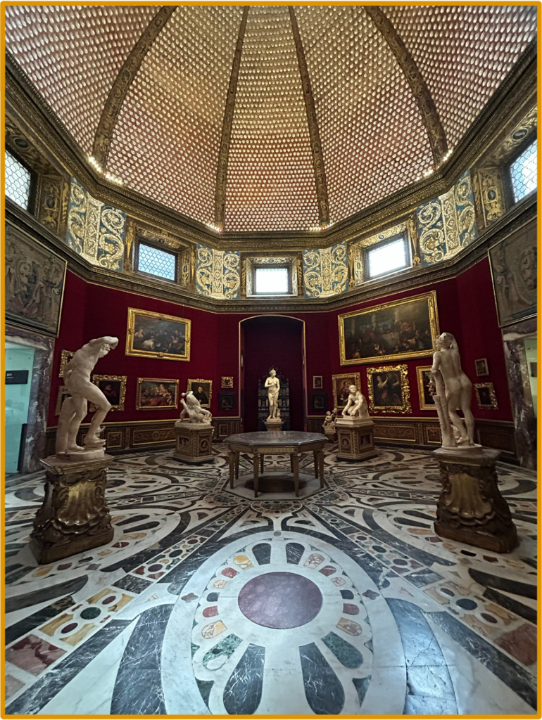 建物自体は昔、メディチ家のオフィスとして使われていたようだ。メディチ家が収集した美術品や、メディチ家の人々の肖像画が展示されている。教科書にも載っているような、ボッティチェリの「ヴィーナスの誕生」「プリマヴェーラ」や、レオナルド・ダ・ヴィンチの「受胎告知」といった、ルネサンス期の名画を見ることができる。美術館自体も、元々が貴族の邸宅のため美しい装飾が至るところに施されていて、どことなくピッティ宮殿と同じような装飾や色遣いのような気がする。