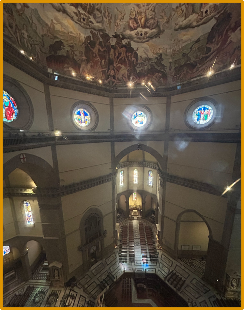 さて、クーポラのチケットで何が見れるかというと、ドゥオーモの一番上の、丸いドームになっている部分に描かれたフレスコ画「最後の審判」を間近で見ることができ、大聖堂の中を上から見下ろすことができ、最上階まで登ってフィレンツェ市内を一望することができる。どれも一見の価値があったのだが、それだけ眺めがいいということは、それだけ高くまで登らないといけないということだ。