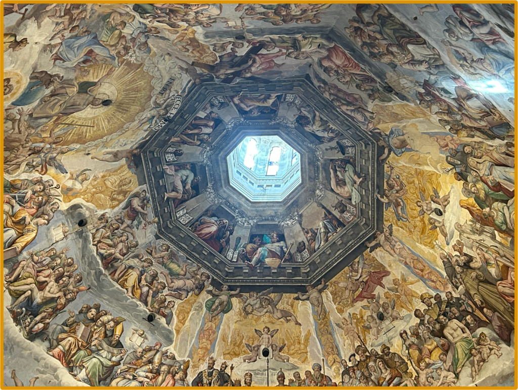 ドゥオーモができた当時からある、無限に続く螺旋階段を登り、まずはフレスコ画を間近に見られる所まで到達。どこを見ても見事だが、特に最上部に描かれた絵の立体感はすごく、彫刻があるのかと錯覚するほどだった。最後の審判といえば、ミケランジェロが描いたシスティーナ礼拝堂のものが有名だが、ここのはミケランジェロの弟子たちが描いたものらしい。