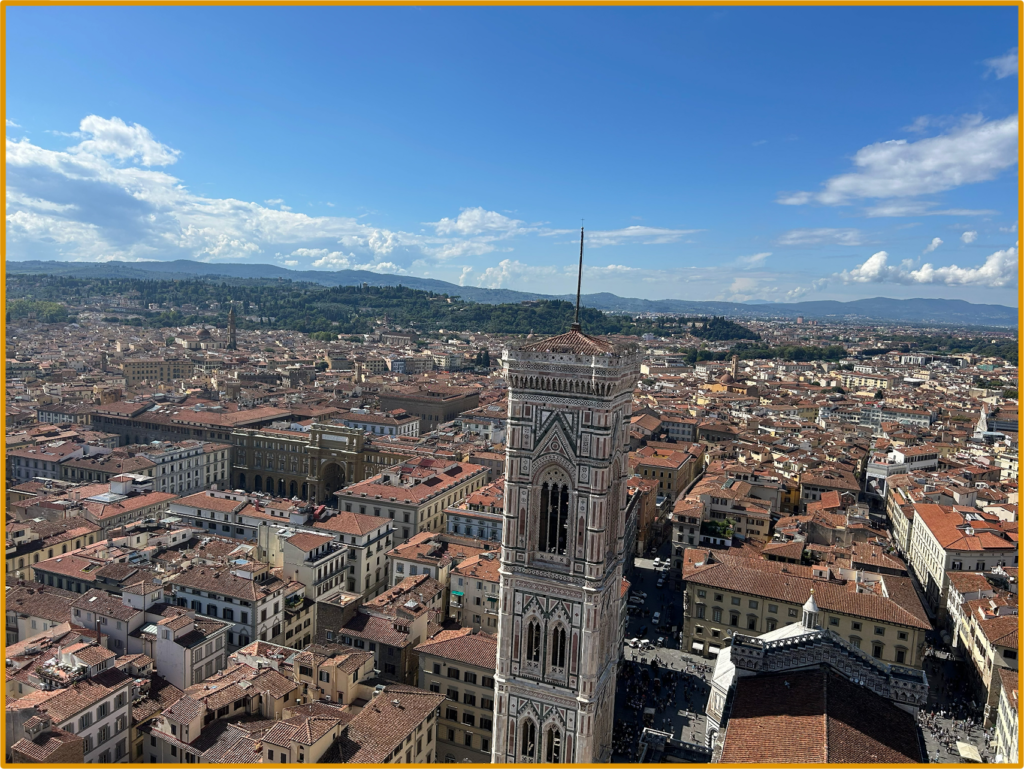 ここで一休みしたあとは、さらに上を目指して狭い階段を登っていく。本当に大変だが、登った先で見られるフィレンツェ市内の景色は本当に綺麗だ。屋根が赤レンガで統一されているからだろうか。ちなみに、体力に余力がある場合は、ジョットの鐘楼という塔にも上ることができ、そこからはドゥオーモを含むフィレンツェ市内の眺めが楽しめる。