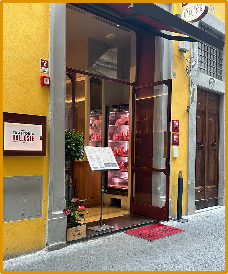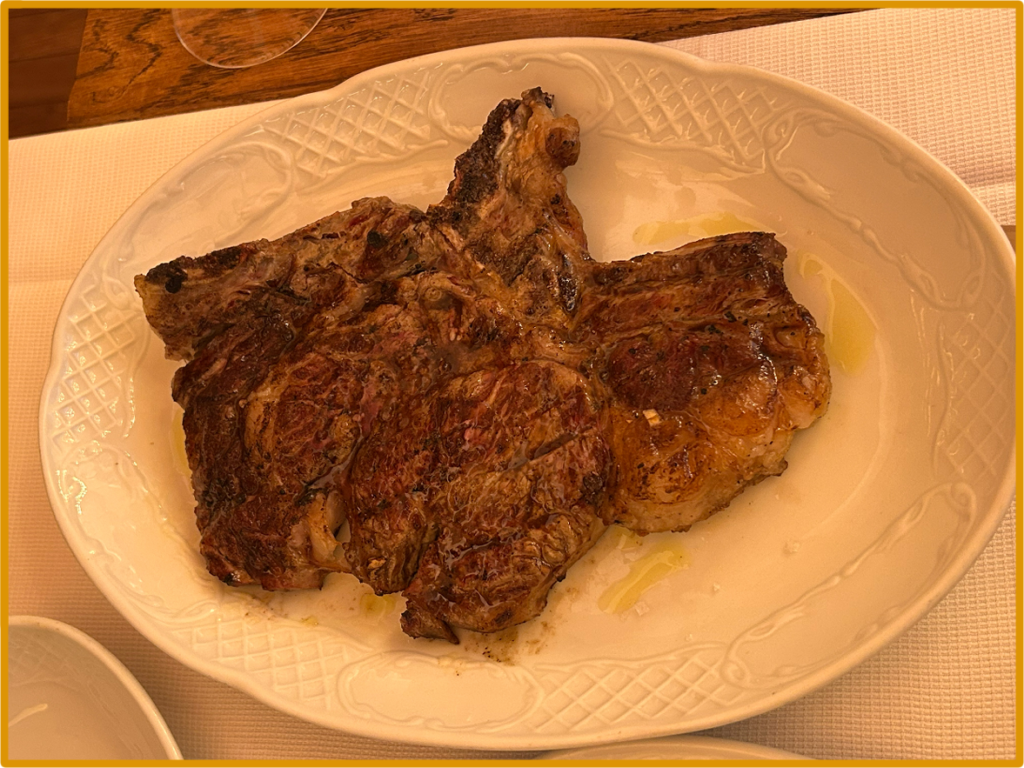 ドゥオーモを後にし、昼ごはんを食べに行くことにする。フィレンツェ名物のビステッカ(牛肉のステーキ)をまだ食べていなかったので、ビステッカを食べに行くことにする。向かったのは、地元の人も美味しいと言うビステッカのチェーン店DALL OSTE。いくつか店舗があり、最初に行こうとしたところは50分待ちだと言われた。50分は待てないのでもう1つの店舗に向かうと、ちょうど空いていたようで入ることができた。ビステッカは、店舗によっては1kgからしか焼いてくれないところもあるが、ここは500gからオーダーできる。2人いれば何とかなる量だ。