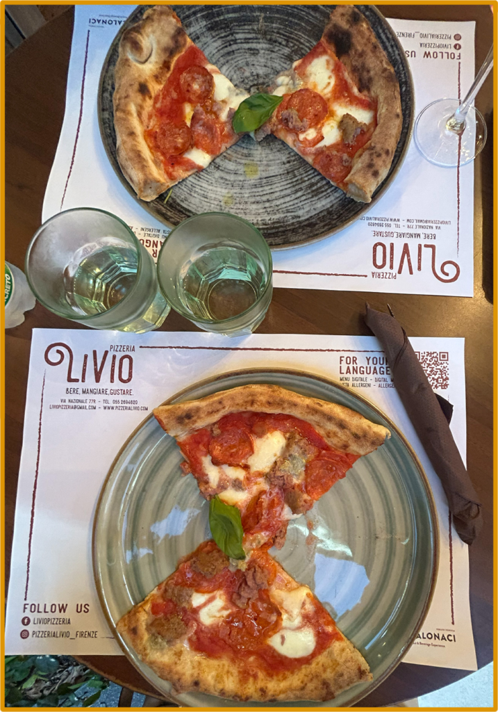 ホテルで一休みし、あまりお腹は空いていないが、ピザを食べに行くことにする。ホテルから近くて評価の高いピザ専門店に向かう。ここで接客してくれたスタッフは、日本語を少し知っていて、HUNTER×HUNTERが好きな気さくな人だった。注文は、モッツァレラチーズとゴルゴンゾーラチーズとサラミとチョリソーとバジルが乗った、ピリ辛のピザとアペロールスプリッツにした。さっきのビステッカの店で味をしめたカクテルだ。ピザは、店内の大きなピザ窯で焼いているようで、求めていたピザの味だった。カクテルも、さっき飲んだのとは少し味が違うが、こちらも美味しい。いやカクテルに関してはこちらの方が好きかもしれない。店を出る時、「オイシカッタデスカ?」と聞かれたので、親指を立てて「美味しかったです!」と返した。良かったらレビューを書いてねと言われ、「OK!」と答えたが、まだレビューは書いていない。