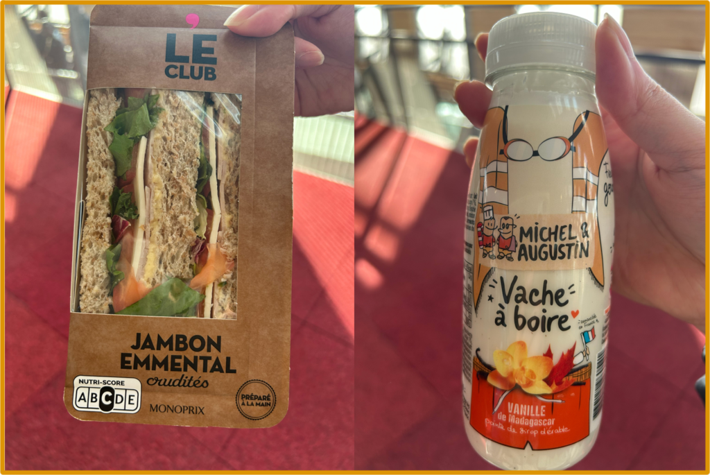 無事空港に着いた。それだけで、今日のミッションはもう成功したようなものだ。7時発のフライトに乗り、8時35分にパリに到着する。次のパリから大阪行きが13時30分発なので、何か空港で食べることにする。EU諸国への便が就航するターミナルから、アジアやアメリカなどの長距離便が出ているターミナルへ移動し、出国審査も受ける。あとはもう飛行機が来たら乗り込むだけ、という状態になったところで、食事できそうな場所を探してみる。しかし、こちらのターミナルには軽食を売っている店舗が3軒と、「Yo!Sushi」という怪しい回転寿司屋だけだった。なんてことだ、フィレンツェからの到着ターミナルには結構美味しそうな店が多かったのに…。フランスに居るのに寿司は違うかなと思い、ヨーグルト飲料とサンドイッチを買ってみる。夫も同じサンドイッチとカフェラテを買い、ベンチに座って食べることにした。このターミナルのベンチ、全ての席に充電ポートがあって素晴らしい。