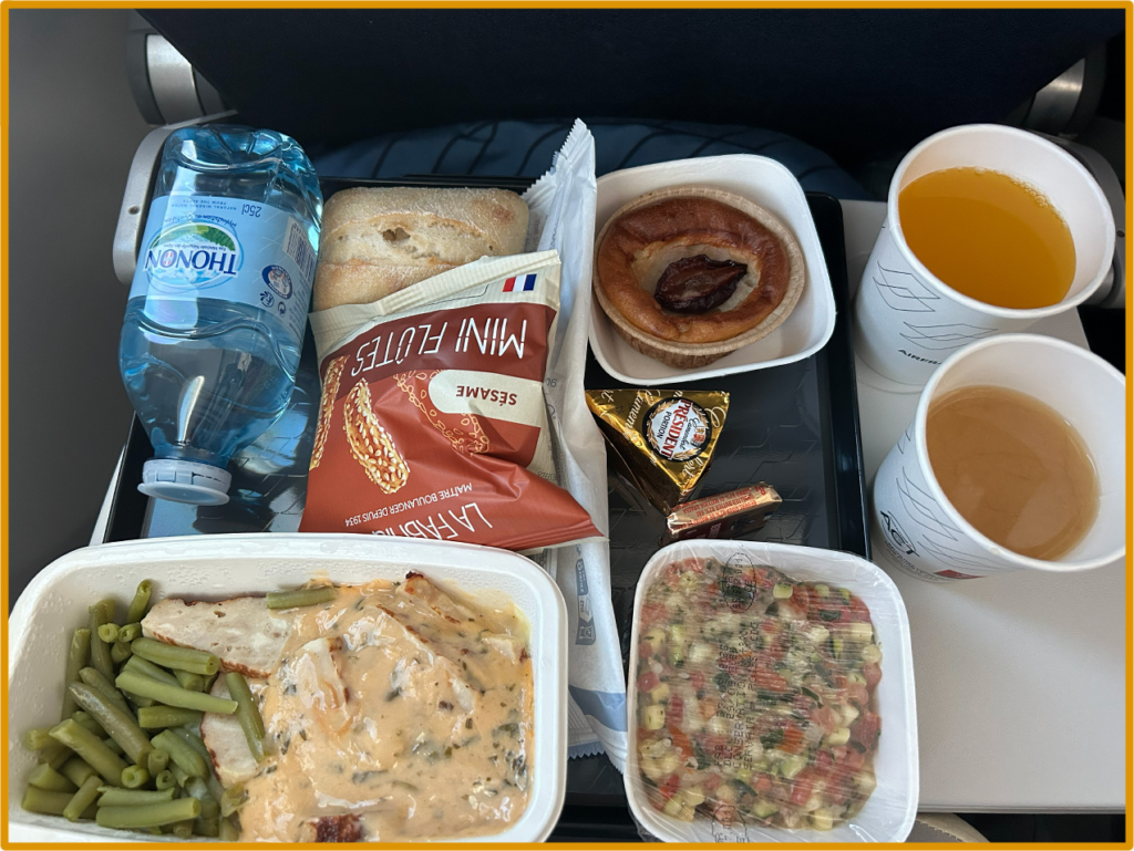 大阪行きの飛行機に乗り込み、機内食を待つ。メニューは、メインが初めて食べる味のチキンソテー、トマトとズッキーニのサラダ、カップケーキ、カマンベールチーズ、パン、行きのフライトでも食べた味のしない乾パンだ。あとは温かいスープも配られる。一番美味しかったのはスープだ。美味しいフランス料理で出てくるスープの味だ。メニューを見ると、味のしない乾パンは、ミニ胡麻スティックパイと表記されていた。パイを名乗ってはいけないと思うのは私だけだろうか。