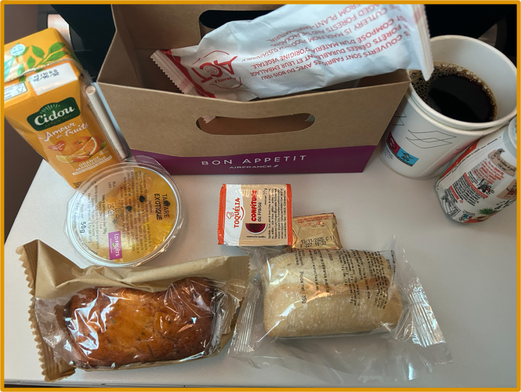 朝の7時半頃、機内食が配られて目を覚ます。眠過ぎて3時間ほど気を失っていた。朝食は、ホットパイ、シロップ漬けのカットフルーツ、パンにバターとジャムがついて、さらにヨーグルトとオレンジジュースもつく。これとは別にコーヒーをいれてもらったが、どう見ても水分が多すぎた。