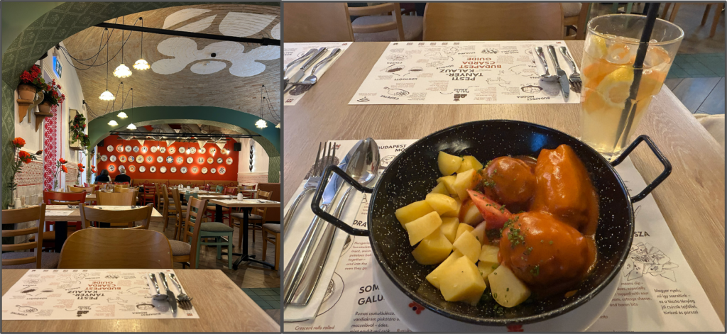 puli és juhászというハンガリー料理の店は、赤、白、緑のハンガリー国旗カラーでまとめられた内装が可愛い。ここでハンガリー名物のグヤーシュスープを頼むつもりだったのだが、パプリカの肉詰めがあまりにも美味しそうだったので、そちらにすることにした。パプリカの肉詰めは、限りなく日本人の舌に合う味付けだった。パプリカに塩胡椒、スパイスの効いた挽肉がたっぷり詰まっていて、トマトソースで煮込まれている。一緒に巨大ミートボールが2つ着いてきたが、一つ一つ味付けが違うのが嬉しい。ついでに大量のじゃがいもも付いている。このじゃがいもさえなければ、もう1品頼めるのに。一緒に注文したレモネードも、ほのかにディルの香りがして美味しい。