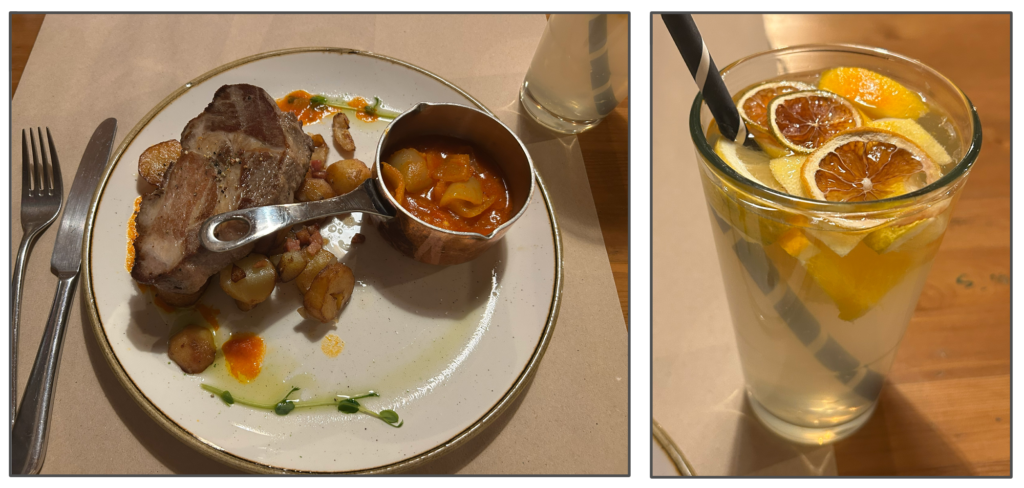 メトロに乗ってレストランに向かうと、ちょっと強面のスタッフが席に案内してくれる。マンガリッツァ豚のステーキと、自家製レモネードを注文。レモネードは、くし切りのオレンジやレモン、ドライフルーツが入っていて風味が豊かだ。そして肝心のマンガリッツァ豚は、感動するほど美味しかった。分厚いステーキなのに、豆腐を切るようにナイフが入り、肉も脂身も柔らかく蕩けるようだ。日本にいると美食のハードルが上がりがちだが、久々に美味しすぎて感動するという体験をした。自家製ラタトゥイユとじゃがいものソテーも美味しい。この店自体、料理が上手いのだろう。個人的にはフォアグラより美味い。