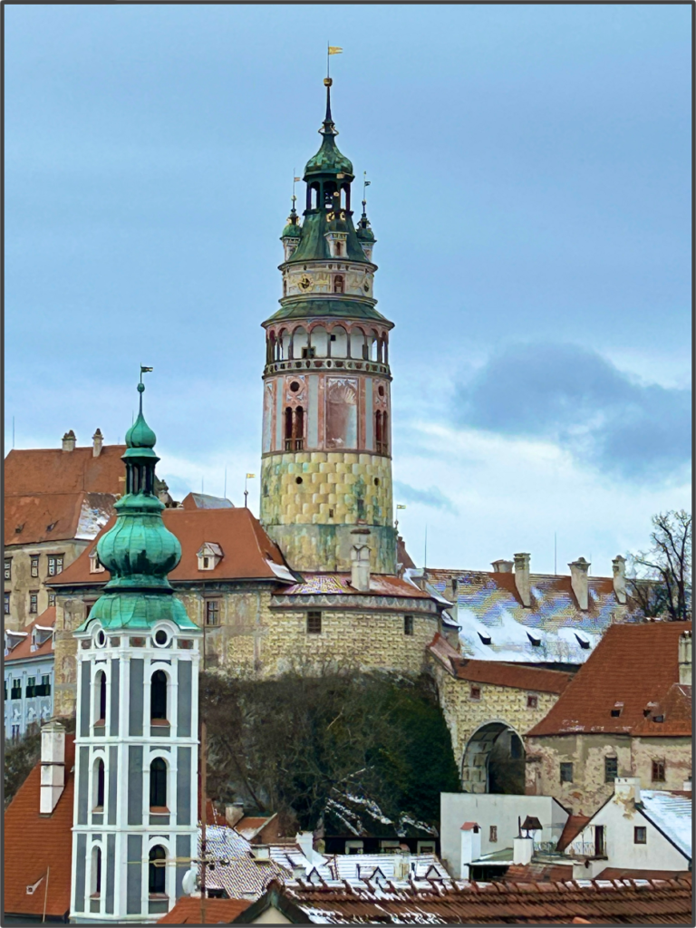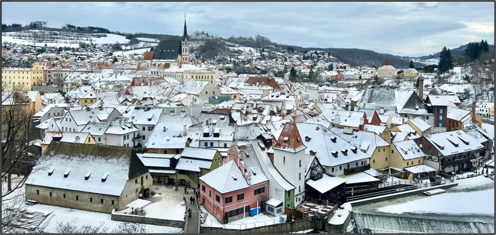 クルムロフ城の壁には、だまし絵の技法を使って立体的に見えるように絵が描かれているのが面白い。城の敷地を通り抜け、クロークの橋を渡り、街が一望できる場所まで辿り着く。この時期は屋根に雪が積もっていて、冬らしい街並みを楽しめるが、青空の下で赤い屋根が連なっている様子を、夏に来て見るのも良いかもしれない。