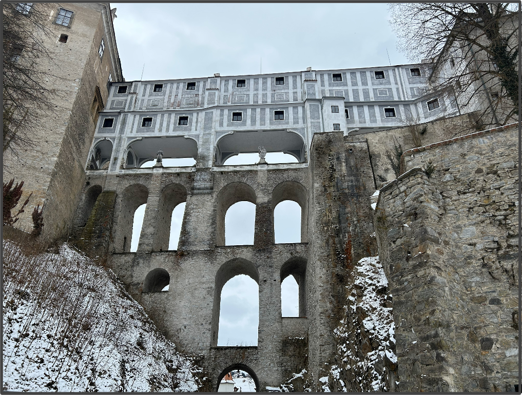 可愛い街を歩きながら、クルムロフ城へ向かう。街から橋を渡ってすぐ、崖の上に城がそびえ立っているのを見ることができるが、本当にファンタジーの世界に迷い込んだかのようだ。夏に来れば城の中にも入れるが、冬はやっていない。しかし冬でも城の敷地に入ることはできるので、全く何も観光できない訳ではない。