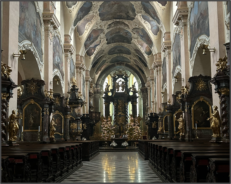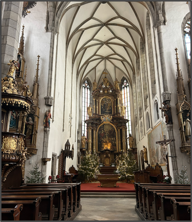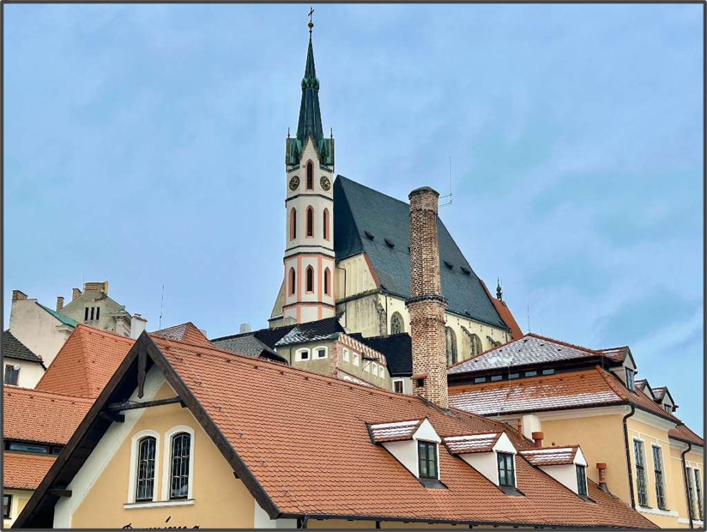 あとは、チェスキークルムロフで見ておくものとして、聖ヴィート教会がある。こちらも塔が可愛いことで有名だ。教会の中も、ピンクのアーチがあったりしてなんとなく可愛い。
