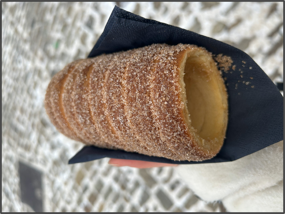 クリスマスマーケットまで戻ってきたので、チェコのお菓子トルデルニークを買い食いしている。棒の周りにケーキ生地を巻き付けて直火で焼いたお菓子で、形は穴が大きいコルネだ。カリカリしていて結構美味しい。ひと口かじる事に、たっぷりまぶされた砂糖が口の周りを汚し、服の上にもボロボロと零れていく。