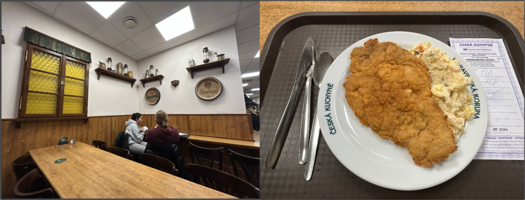 入口で伝票をもらい、大学の学食みたいにトレイを持って列に並び、パネルに表示されたメニューの番号をカウンターで伝える。そして伝票に注文した料理をチェックしてもらい、かわりに料理を受け取る。支払いは帰る時に伝票を渡し、クレカなどで支払うという方式だ。なかなか面白いし、味も普通の学食ぐらい美味しく、安い。私が頼んだのはシュニッツェルという薄く伸ばした豚肉のフライだ。付け合せは、大量の茹でたじゃがいもか、大量のポテトサラダか選べたので、ポテトサラダにしておく。シュニッツェルも巨大でポテトサラダも大量なので、1品で満腹になってしまうが、デザートも注文できる。なお、アルコールが飲めるならチェコビールも安く飲める。120CZKで満腹になったので、コスパは最強だった。