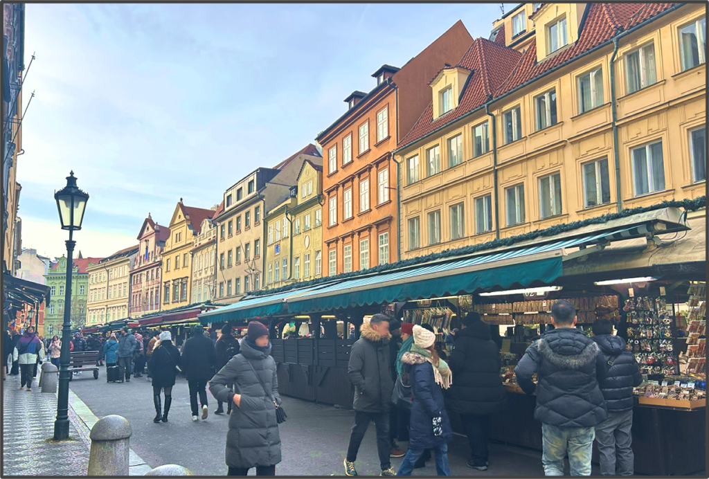 食べた後は、ギフトショップを覗きながら旧市庁舎広場を抜け、ホテルに戻る。新年がすぐそこだからか、広場ではチェコ語で歌いながら踊っている人の集団がいたり、ステージでライブをやっていたりする。ホテルのレストランでも、ライブを聴きながらコースディナーをいただくことができるのだが、なんと8万円ぐらいする。8,000円だったら参加したが、高すぎるので見送った。