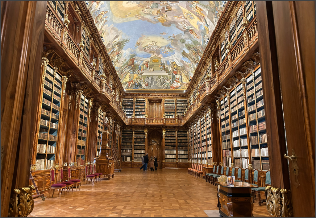 さて、肝心の図書室は本当に美しかった。この空間にいると、魔法が使えそうな気になってくる。図書室は2つあり、それぞれ「哲学の間」「神学の間」と呼ばれている。どちらもバロック様式で作られており、細やかな装飾と天井のフレスコ画が見事だ。クレメンティヌムの図書室とどちらが美しいかというと、かなり良い勝負ではある。が、個人的にはクレメンティヌムの方が、ずらりと並んだ天球儀がファンタジー感を盛り上げるのに貢献している気がするので好きかもしれない。